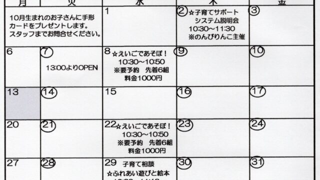 イベントスケジュール 10月のイベントスケジュール 風はすっかり秋めいてきましたが、まだまだ暑い日もあり、不安定なお天気が多いですが、広場は元気にオープンしておりますのでぜひ遊びに来てください^^♪要予約イベント♪☆えいごであそぼ! 8日・22日 先着6名 1,000円☆ふれあい遊びと絵本 ... 2025.09.16 イベントスケジュール