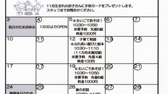 年末の足音が少しずつ聞こえてきましたね。。。あっという間ですが、元気に広場をOPENしてお待ちしておりますのでぜひ遊びに来てください♪♪要予約イベント♪☆えいごであそぼ! 5日・19日 先着6名 1,000円(1カ月前受付開始)☆ふれあい遊...