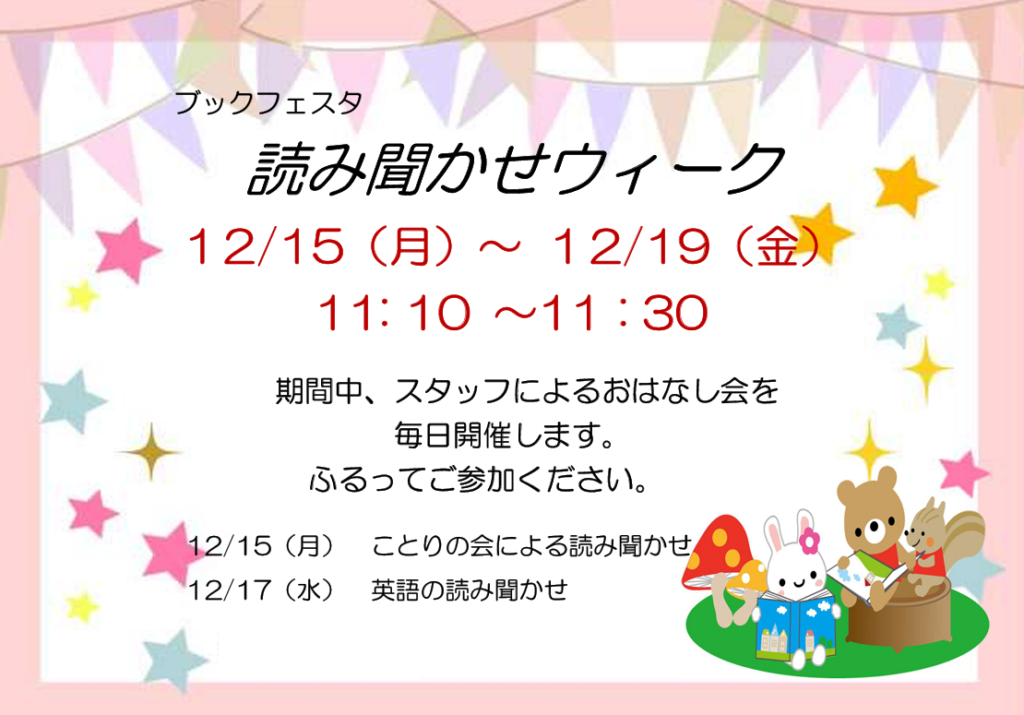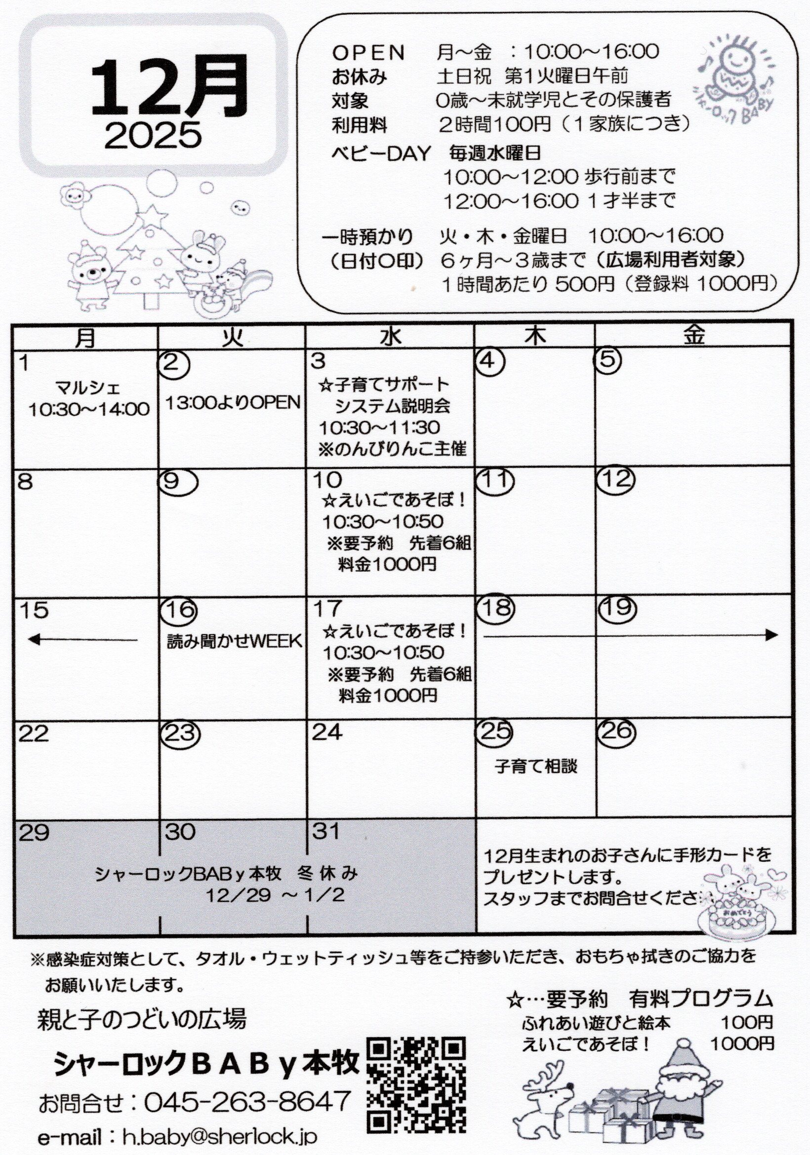 12月読み聞かせウィークのお知らせ 2025.12.04 一気に寒くなりましたね💦 さて、11月から「なか区ブックフェスタ」が始まっています! いろいろな場所で本に触れるイベントを開催している中、 シャーロックBABy本牧でも先だってスタッフおすすめの本を掲示しています。 そして、15日(月)~19日(金)読み聞かせウィークといたします^^ 11:10~11:30に地域の方やスタッフによる読み聞かせを行う予定です♪ ご予約は必要ありませんので、お気軽に広場へ遊びにきてください⭐