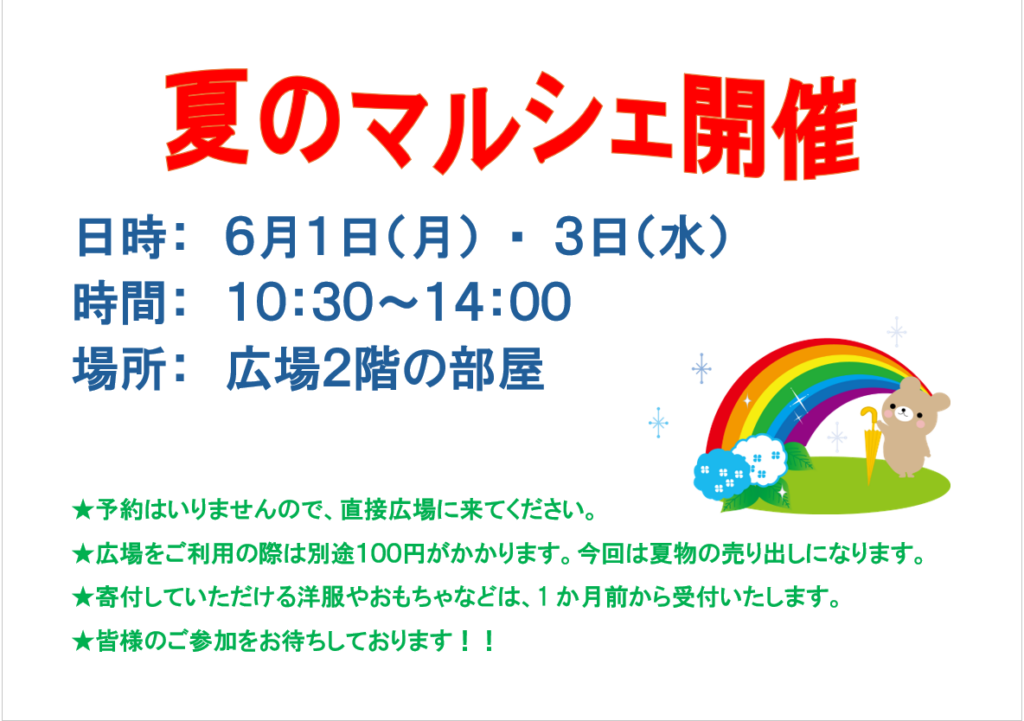 予告♪マルシェ 2026.04.10 6月1日(月)、3日(水)10:30~14:00にマルシェを予定しています!今回は「夏物」をご用意いたします。ご寄付は5月7日(木)より、受け付けいたします。衣替え、ゴールデンウィークのお掃除!?などの際、眠っている夏物お洋服や、おもちゃ、絵本、靴、その他便利グッズなどが見つかりましたら、広場までお持ちいただけますでしょうか。どうぞよろしくお願いいたします☆